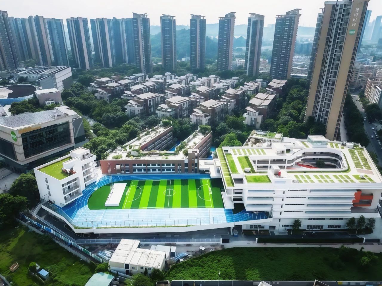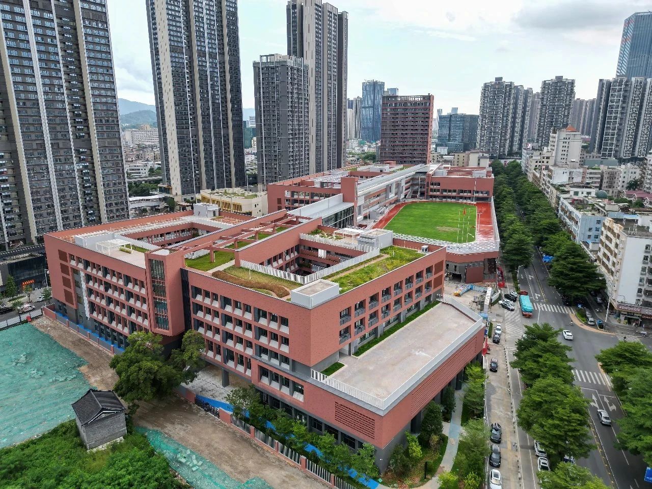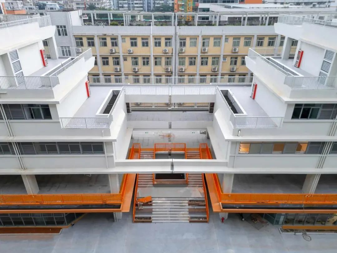 设计亮点:在深圳高密度城市背景下采用垂直校园建设,以“客家围屋”格局形成北侧为“知识”自然书院、南侧为“运动”活力场院的南北两进院落;校园通过扩建增加东侧展示架,西侧打造屋面活动平台,北侧布置新建教学楼,底部架空中心庭院穿插于建筑内部,不同标高退台与屋面构成空中垂直绿化空间、新老建筑之间设计的综合体系。