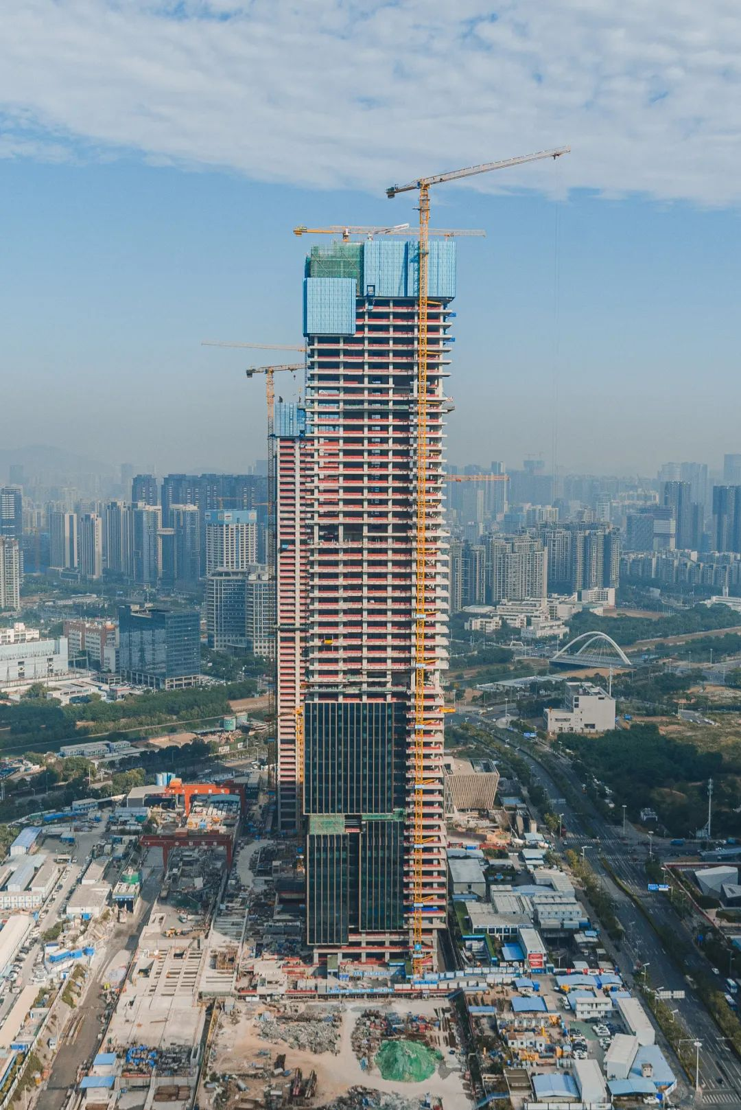 该项目位于南山区深圳湾超级总部基地,占地面积为3.6万平方米,将建设成集办公、商业、酒店、文化、交通于一体的超高层双塔地标TOD综合体。项目采用装配式钢结构技术快速建造,综合应用多项智能建造创新技术。如基于BIM-nD理念的数字化管理平台,实现建造过程关键数据实时映射和追溯;超高层智能顶升平台,集成多款智能机器人和装备,形成流水线式高效建造模式;实行数字化交付,为今后智慧运维管理平台建立“数据底座”。