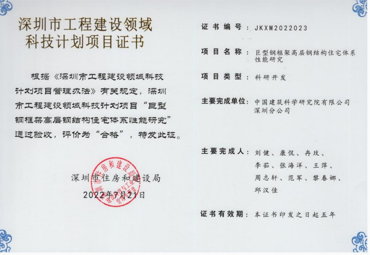 该项目是深圳市工程建设领域科技计划项目,巨型钢框架高层钢结构住宅结构体系,是根据已有的巨型钢框架结构体系的特点和多层装配式住宅的成熟经验,将巨型钢框架作为主结构、主框架间的多层结构作为次结构,将二者有机结合,从而形成的一种新型高层钢结构住宅结构体系。