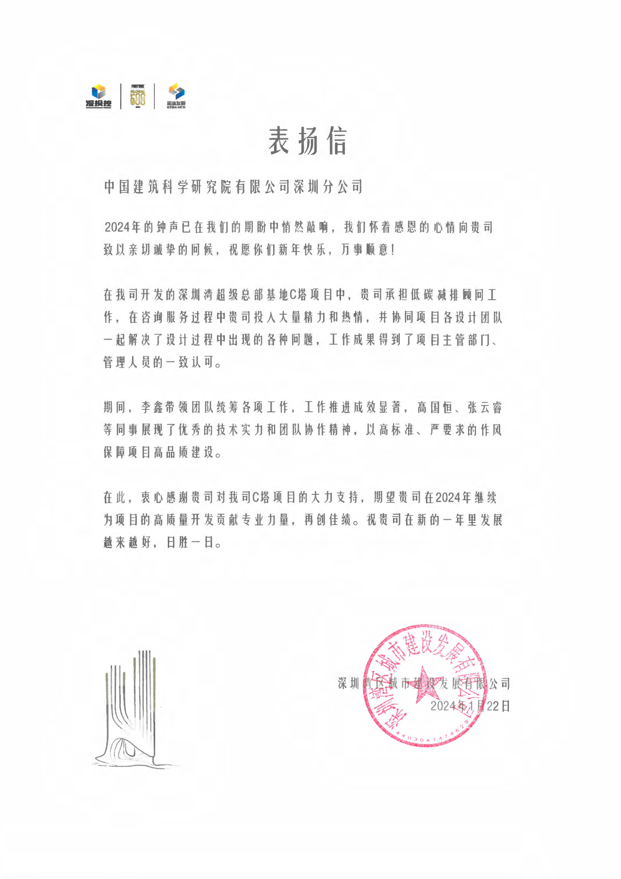 近期,中国建研院深圳分明博足球app下载收到深圳湾区城市建设发展有限明博足球app下载发来的表扬信,对中国建研院深圳分明博足球app下载在深圳湾超级总部基地C塔项目中卓越工作能力和高效工作态度表示肯定。