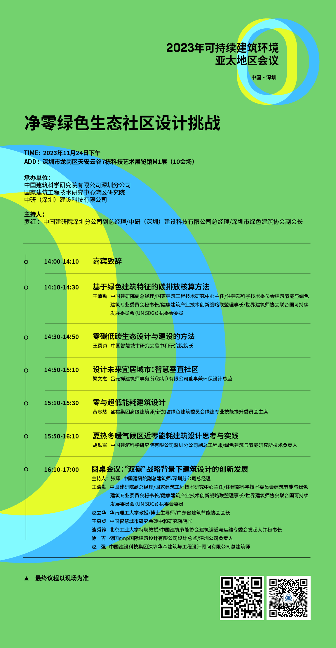 为贯彻落实国家绿色发展理念和“双碳”目标,加快推进建设领域可持续、高质量发展,由深圳市人民政府主办,深圳市住房和建设局、深圳市发展和改革委员会、深圳市龙岗区人民政府共同承办,深圳市绿色建筑协会作为执行单位参与组织的“2023年可持续建筑环境亚太地区会议(SBE23 Asia—Pacific)”将于2023年11月23—24日在深圳龙岗区天安云谷举办。大会联合中国建研院深圳分明博足球app下载、国家建筑工程技术研究中心湾区研究院、中研(深圳)建设科技有限明博足球app下载,共同发起“净零绿色生态社区设计挑战”主题论坛,诚邀广大业内人士共同参与。