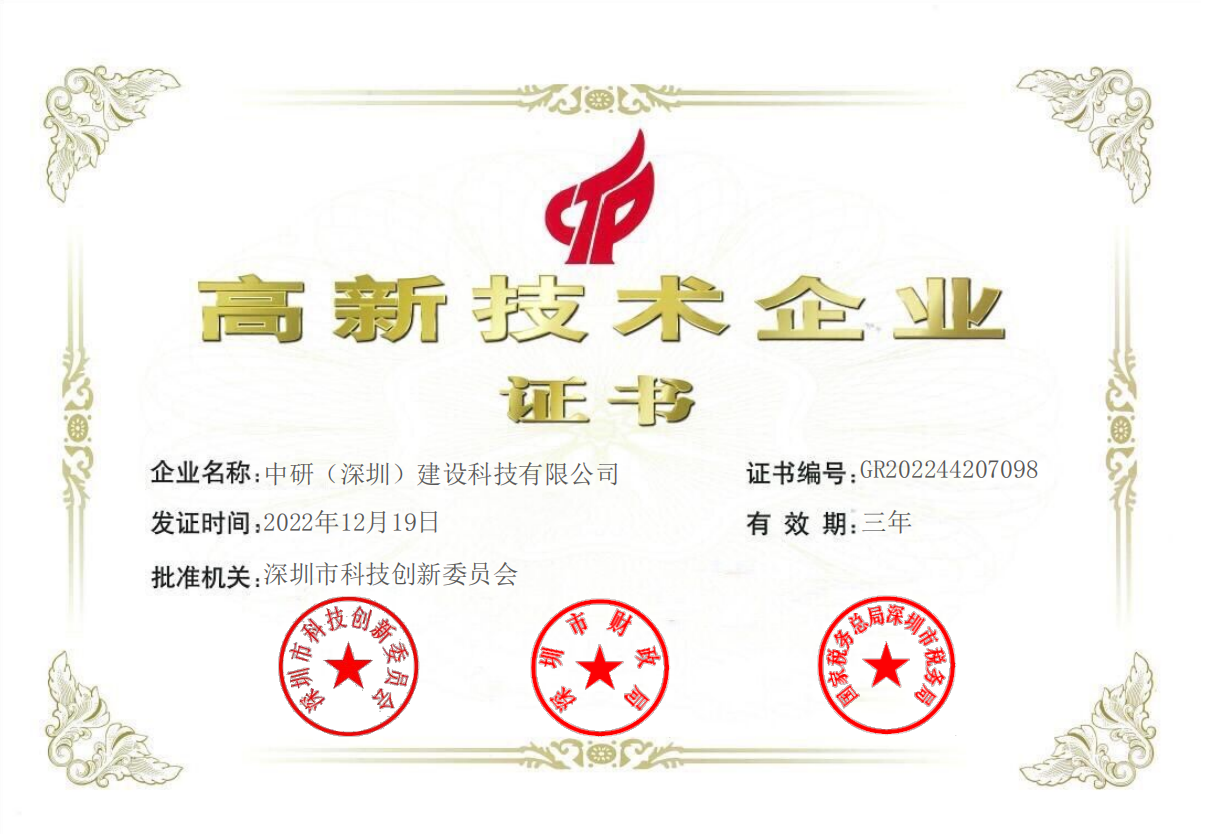 日前,中研(深圳)建设科技有限明博足球app下载(下称中研科技)顺利通过评审,获得了国家高新技术企业认定证书(证书编号:GR202244207098),由此正式迈入国家高新技术企业行列,开启新篇章。