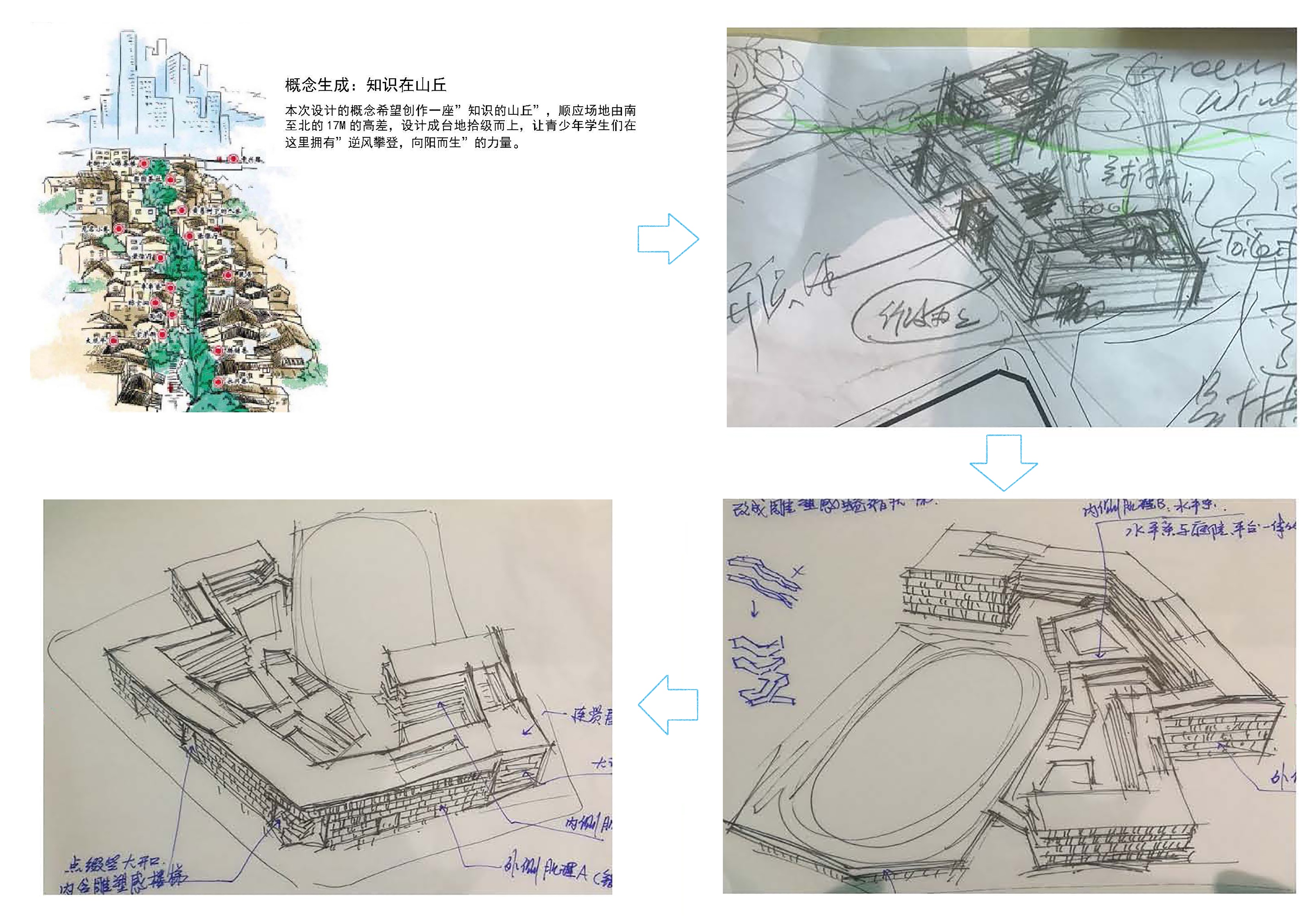 “书山有路勤为径,学海无涯苦作舟”,求学之路道阻且难,每一位学子都须要倾其十余年心血,方能在学业上有所小成。我司深圳龙胜学校建筑方案以“知识的山丘”设计概念,将求学的攀登之路与项目的地形地貌相结合,为学校创作了一个寓理于景的立体式校园设计方案,以期展现莘莘学子勤勉求学的画卷。