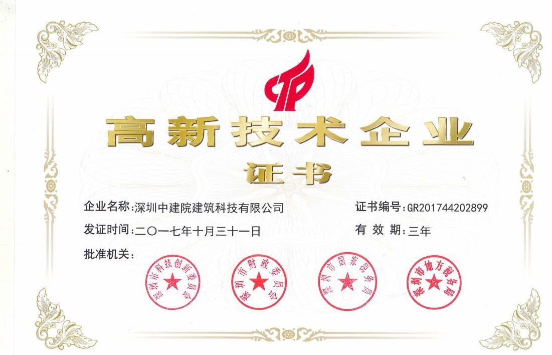 日前,全国高新技术企业认定管理工作领导小组办公室公布了2017年深圳市第二批国家高新技术企业名单,深圳中建院建筑科技有限明博足球app下载(以下简称“深圳中建院”)通过严格评审,荣获国家高新技术企业认定(证书编号:GR201744202899)。