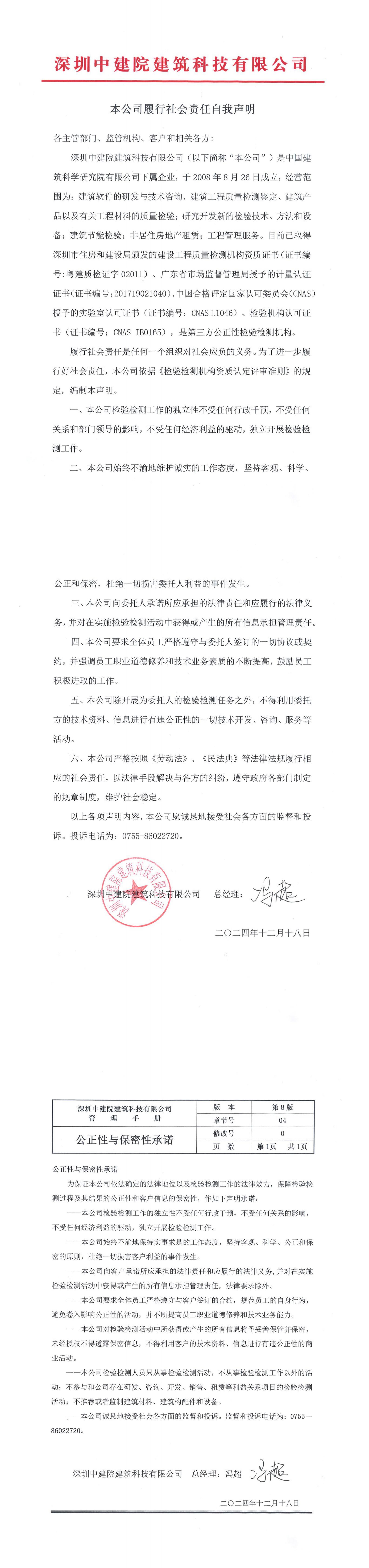 深圳中建院履行社会责任自我声明、公正性与保密性承诺